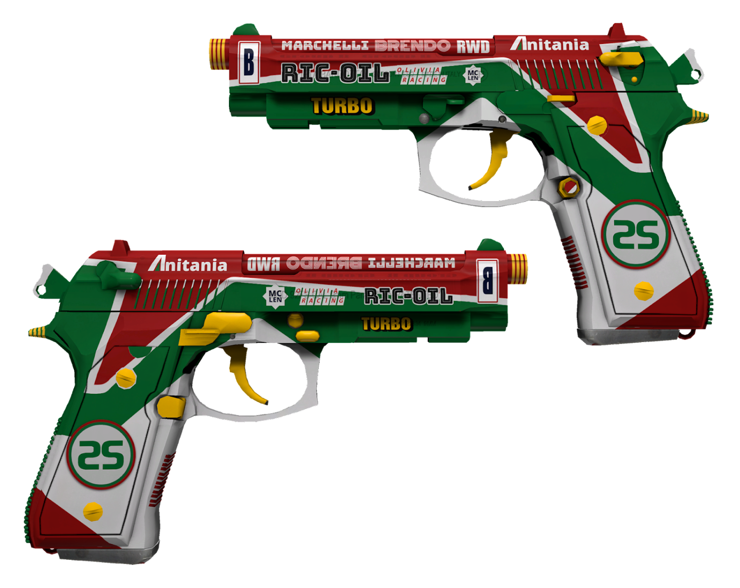 The design of Dual Berettas Twin Turbo resembles the Italian flag in color scheme, with styling inspired by race cars. This livery could be seen on Formula 1 vehicles, so it looks excellent when applied to these paired pistols. The contrast of red, green, and white, combined with inscriptions, symbols, and yellow accents, makes for a memorable look — and the creators succeeded perfectly.