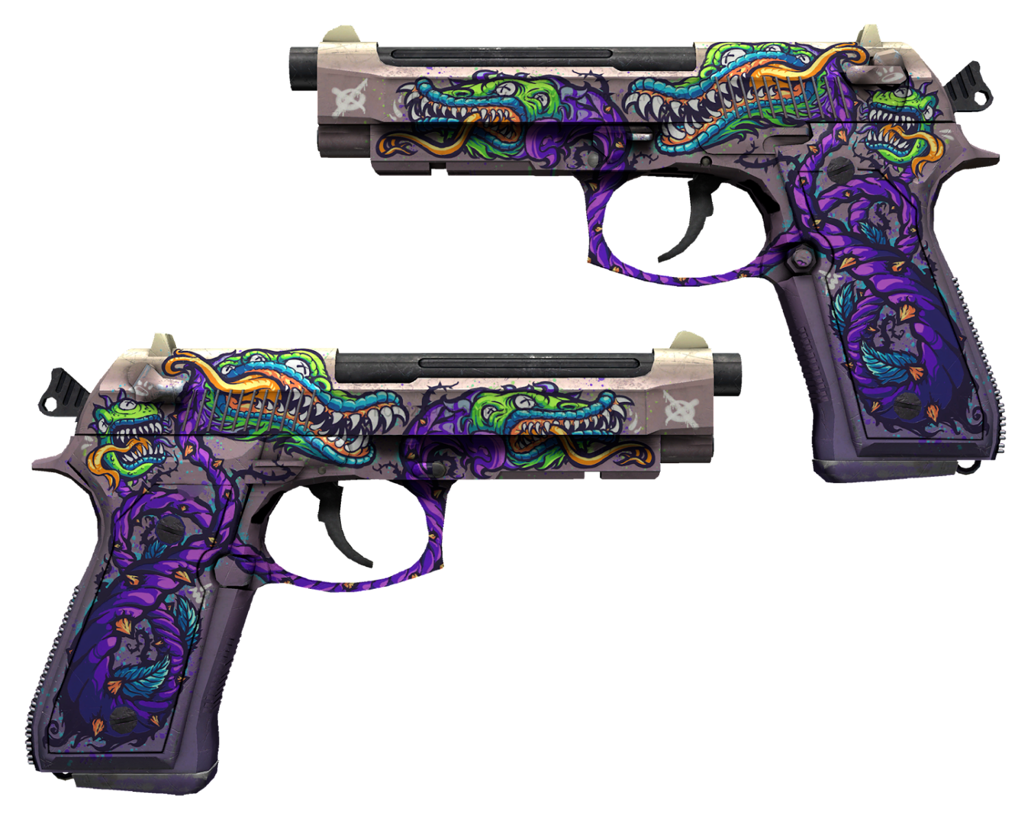 One of the most vivid skins for Dual Berettas is undoubtedly Flora Carnivora. The artwork style resembles bright graffiti. Branches of a carnivorous plant wrap around the grip and climb up the barrel, transforming into toothy jaws aimed at the enemy. Bright purple, acid green, light blue on an orange background — this design is unmistakable.