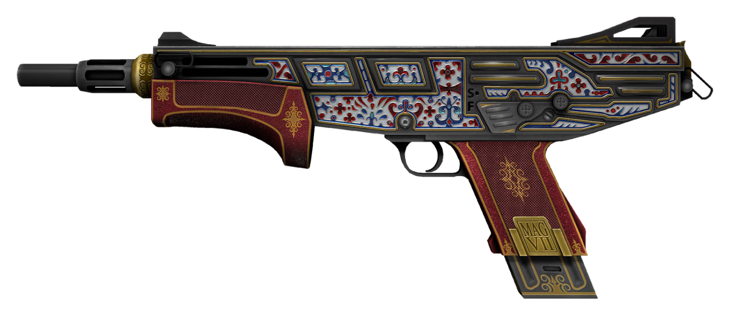 One of the most expensive skins for this weapon is MAG-7 Cinquedea from the 'Canals' collection. Its standout feature is the meticulously crafted vintage-style decorative elements. The body is adorned with white enamel plates featuring blue and red patterns, while the grip and lower barrel are painted brown. On higher-float versions, the pattern not only shows wear but also darkens, making well-preserved copies highly valued.