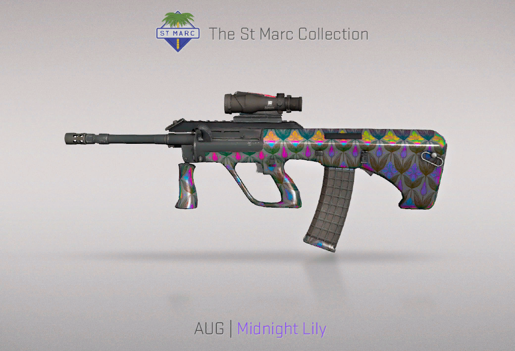 Another skin where the holographic effect is clearly visible is AUG Midnight Lily. The weapon body is colored gray and covered with a lily pattern, whose placement depends on the pattern index. However, in-game it looks noticeably brighter than in many screenshots, as flower colors shift depending on lighting conditions.