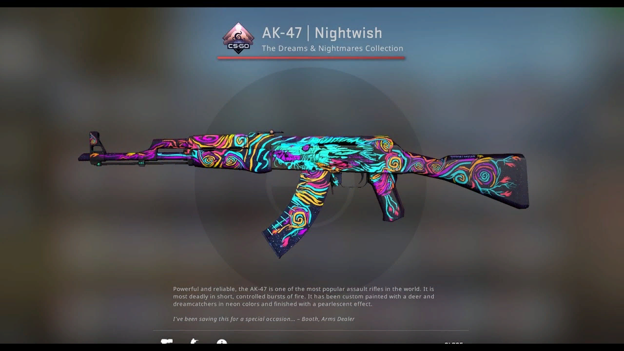 AK-47 Nightwish looks vibrant even without effects: the weapon body is covered in psychedelic patterns on a black background. Amidst the chaos of blue, yellow, and red-purple lines, you can spot the head of a predatory beast with glowing eyes, occupying the center of the rifle. As the skin's creator, Nextgenz, explains, the pearlescent effect further emphasizes the surreal nature of the artwork and creates an illusion of shifting colors.